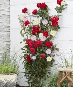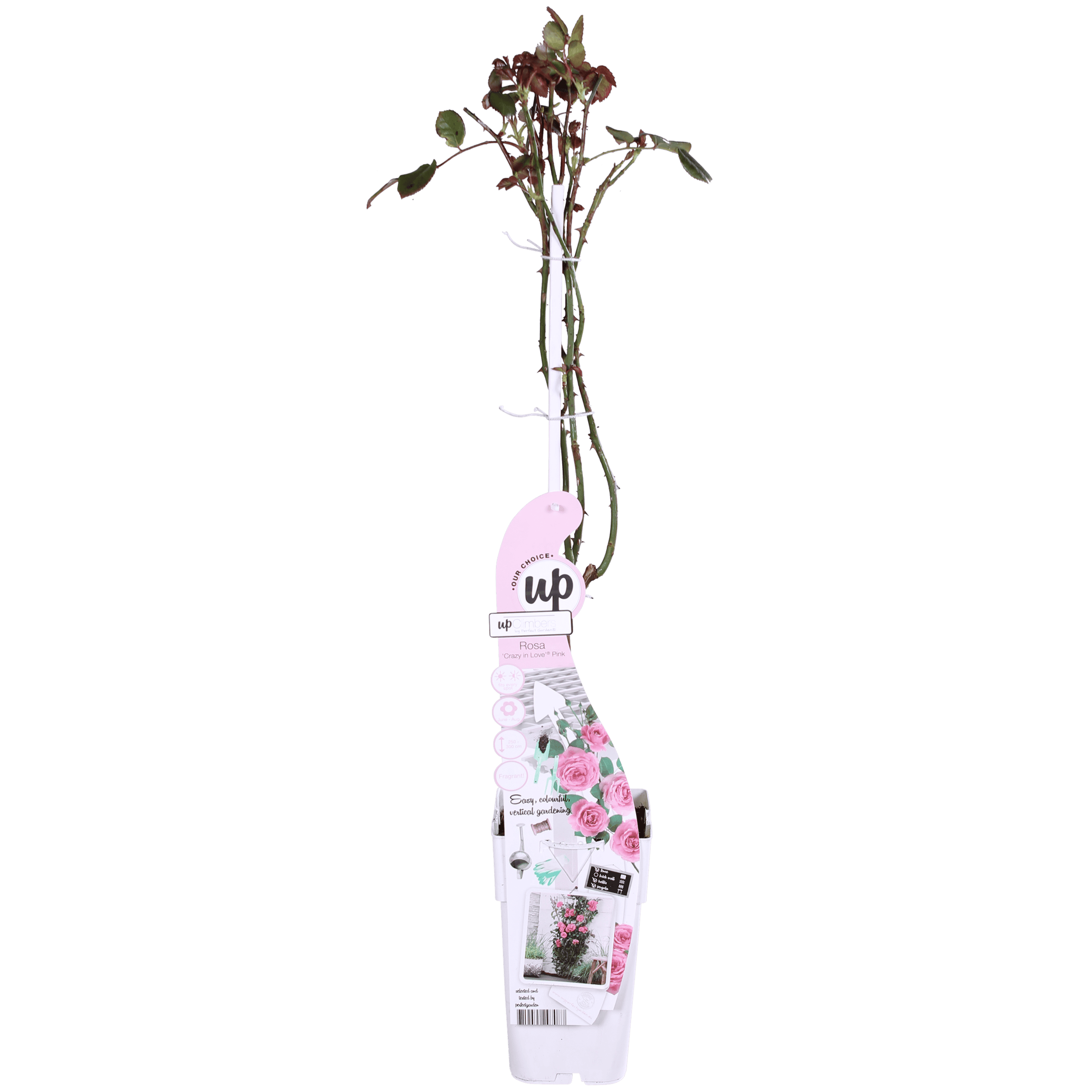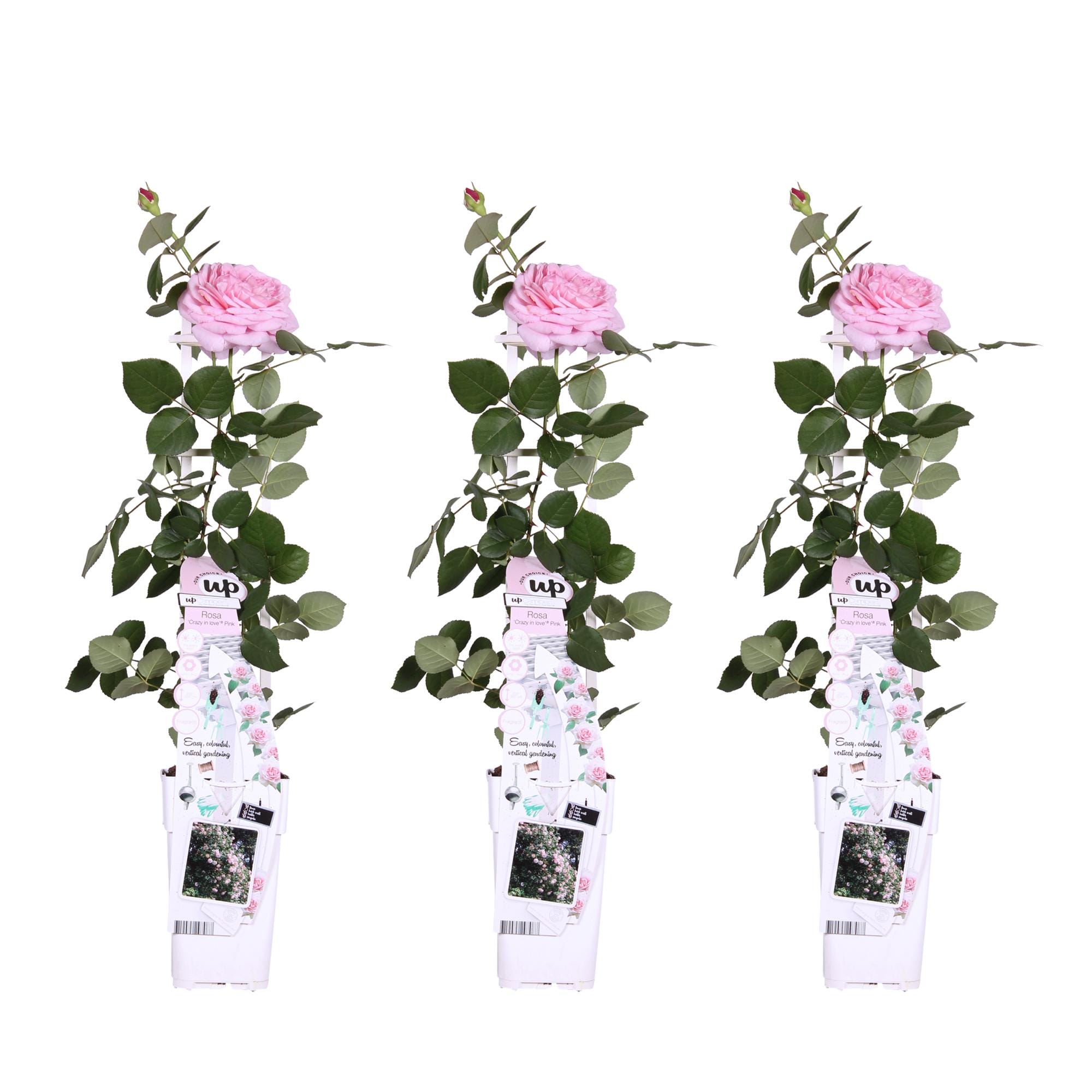 ‘Rosa Crazy in love Pink’ is een populaire roze klimroos met frisgroene glimmende bladeren. Rozen behoren al honderden jaren tot een van de bekendste en meest aangeplante groep planten. De roos heeft in verschillende culturen een symbolische waarde. Al in de oudheid werden er tempels en paleizen mee versierd. De roos begint te bloeien in juni en bloeit door tot aan de eerste vorst in oktober of november. Om het bloeien te stimuleren is het raadzaam om oude en uitgebloeide bloemen te verwijderen. De klimroos houdt van een zonnige standplaats, en voor de mooiste groei kun je hem het beste om het jaar tot zo’n 30 centimeter boven de grond terug snoeien.