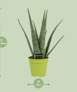 – Aloe is een mooie en veelzijdige plant die geleverd wordt in een compact formaat van 15 cm.- Met een huidige hoogte van ongeveer 55 cm voegt deze aloëplant een vleugje elegantie toe aan elke ruimte.- Deze onderhoudsvriendelijke plant gedijt op een zonnige plek, waardoor het een perfecte toevoeging is aan jouw zonovergoten tuin of binnenruimte.- Het verzorgen van aloë is eenvoudig, omdat het weinig water nodig heeft en bestand is tegen periodes van verwaarlozing.- Met zijn opvallende, puntige bladeren en levendige groene kleur zal aloë zeker een opvallend kenmerk zijn in elke plantencollectie.