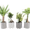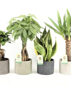 De Pachira (die ook wel watercacao of geldboom genoemd wordt) is een mooie palm, met een gevlochten stam. De Ficus ‘Gin Seng’ , die rijk is aan bladeren, is een mooie miniatuur van de vertrouwde grote variant. De hippe en stijlvolle Sanseveria ‘Futura Superba’, die ook Vrouwentong genoemd wordt, is een klassieker, die bezig is aan mooie comeback.