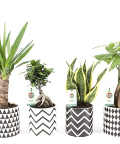 De Amazone Mix bestaat uit een combinatie van de Yucca, de Ficus Gin Seng, Pachira Aquatica en de Sansevieria in bijzondere sierpotten van keramiek.