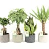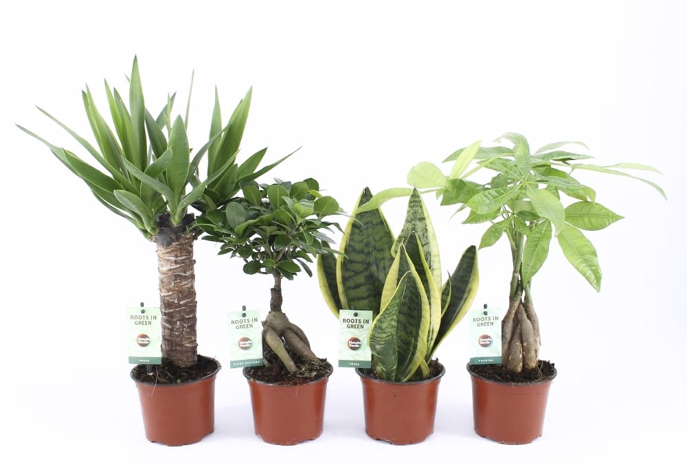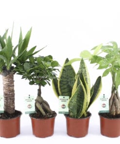 De Pachira (die ook wel watercacao of geldboom genoemd wordt) is een mooie palm, met een gevlochten stam. De Ficus ‘Gin Seng’ , die rijk is aan bladeren, is een mooie miniatuur van de vertrouwde grote variant. De hippe en stijlvolle Sanseveria ‘Futura Superba’, die ook Vrouwentong genoemd wordt, is een klassieker, die bezig is aan mooie comeback.
