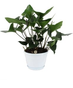 Deze fraaie Anthurium is bijzonder door de pijlvormige bladeren en hoge luchtwortels. De donkergroene bladeren glanzen alsof ze voorzien zijn van een laklaagje.