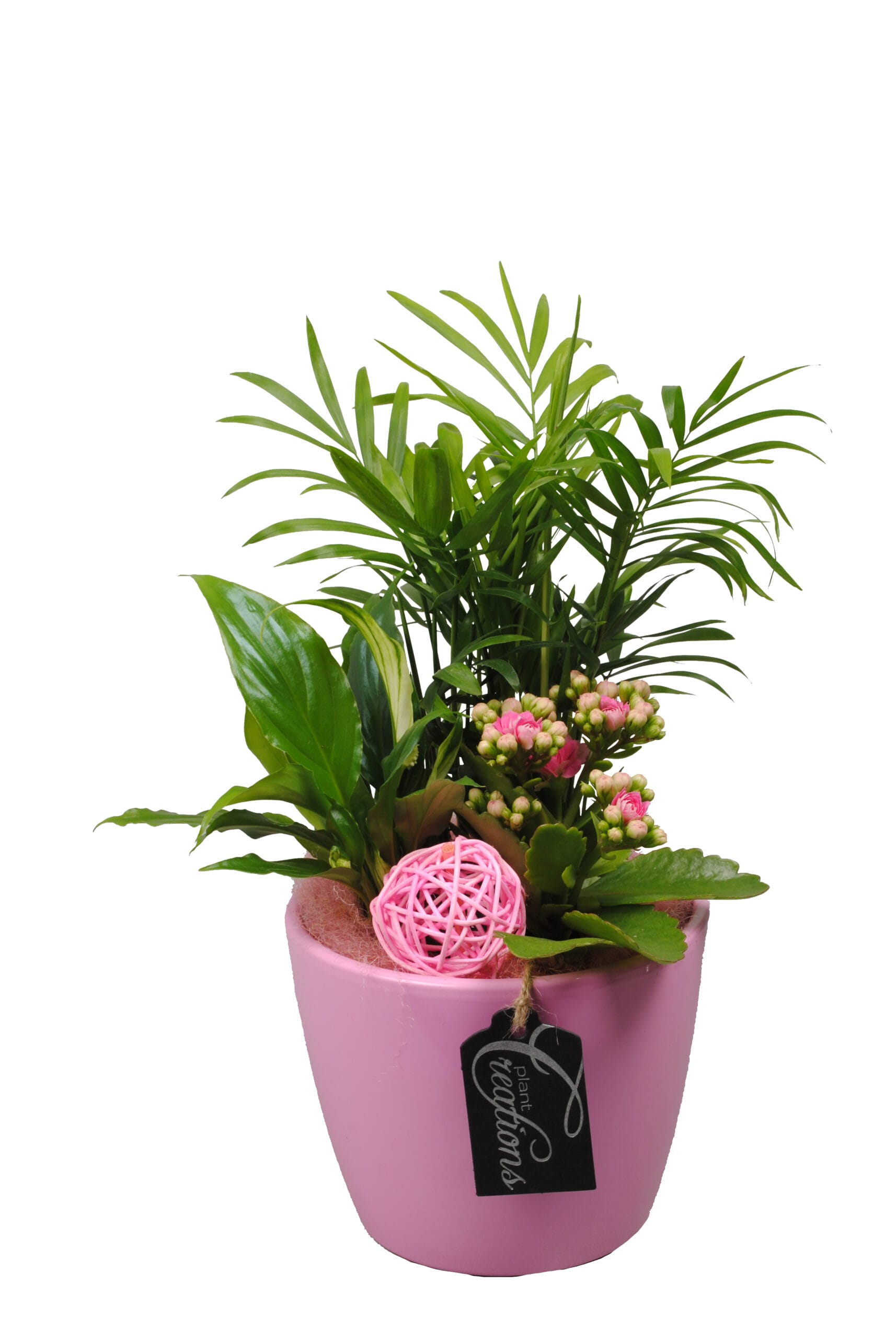 Een fleurig arrangement, wie wordt daar nou niet blij van. In dit arrangement zitten een Chamaedorea, Spathiphyllum en een Kalanchoe. Het arrangement is afgewerkt met wooly en een ratan bal en zit in een keramieke pot,