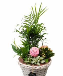 Een fleurig arrangement, wie wordt daar nou niet blij van. In dit arrangement zitten een Chamaedoria, Spathiphyllum, Fittonia en een Kalanchoe. Het arrangement is afgewerkt met wooly en een ratan bal en zit in een mand.