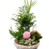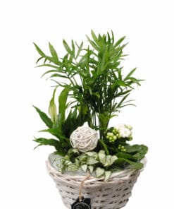 Een fleurig arrangement, wie wordt daar nou niet blij van. In dit arrangement zitten een Chamaedoria, Spathiphyllum, Fittonia en een Kalanchoe. Het arrangement is afgewerkt met wooly en een ratan bal en zit in een mand.