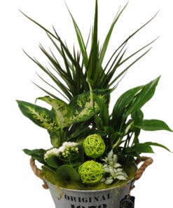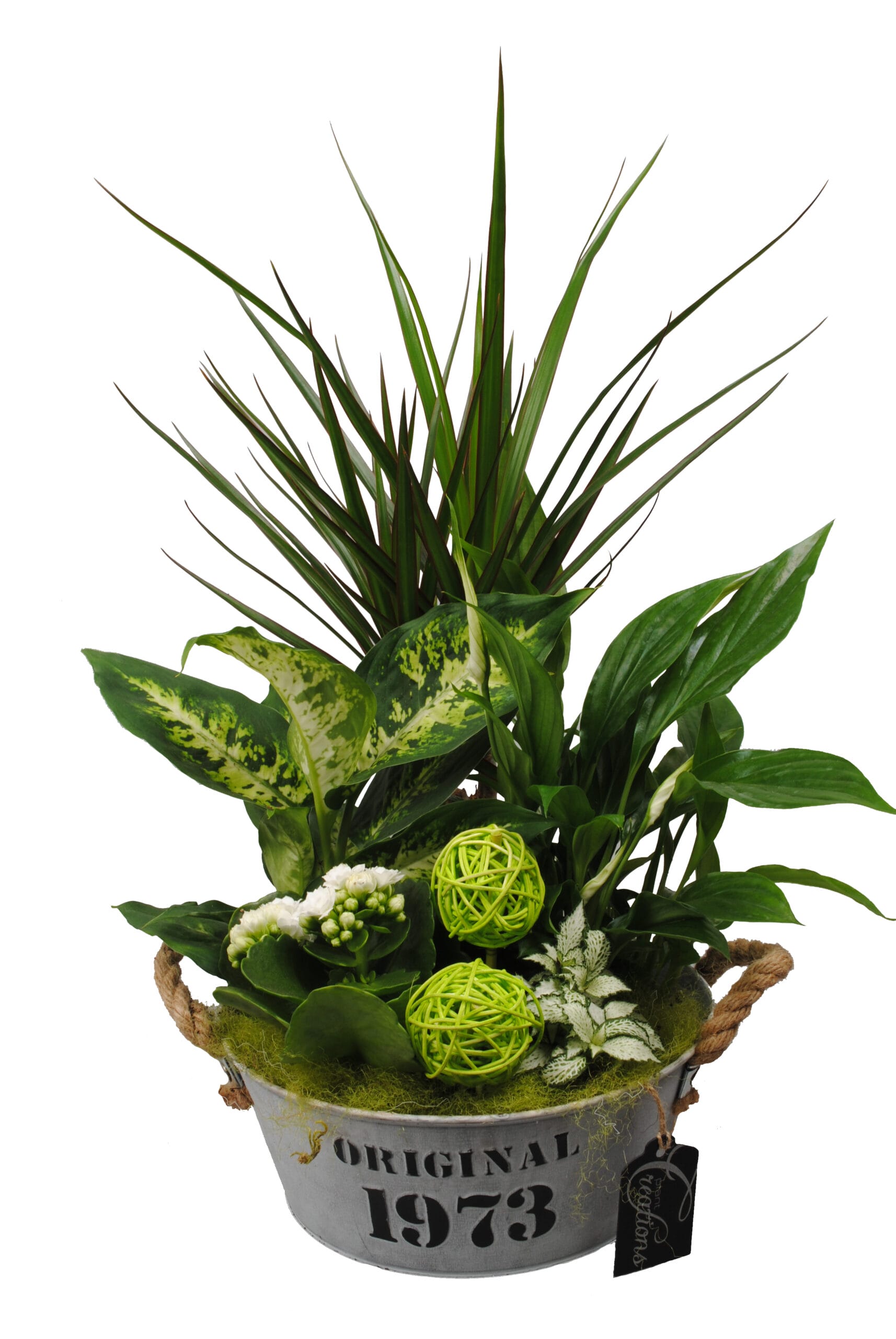 Een fleurig arrangement, wie wordt daar nou niet blij van. In dit arrangement zitten een Dieffenbachia, Dracaena, Spathiphyllum, Fittonia en een Kalanchoe. Het arrangement is afgewerkt met wooly en 2 ratan ballen en zit in een zinken teiltje met scheepstouw handvatten.