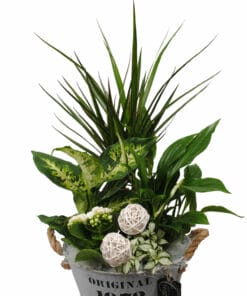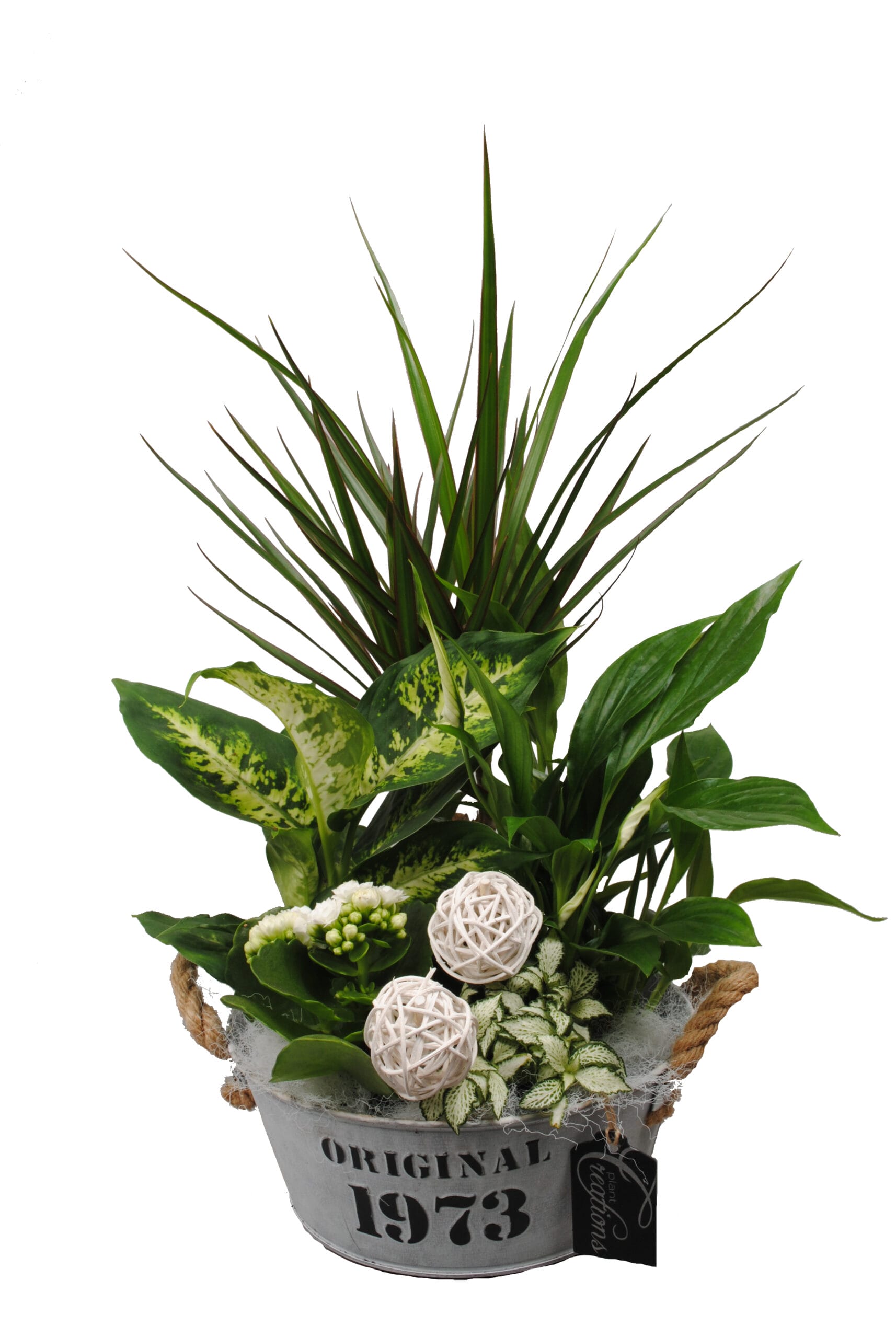 Een fleurig arrangement, wie wordt daar nou niet blij van. In dit arrangement zitten een Dieffenbachia, Dracaena, Spathiphyllum, Fittonia en een Kalanchoe. Het arrangement is afgewerkt met wooly en 2 ratan ballen en zit in een zinken teiltje met scheepstouw handvatten.