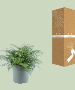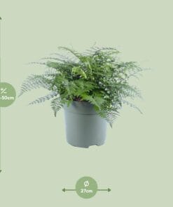 Maak kennis met de Asplenium Parvati, ook bekend als Spleenwort. Deze prachtige kamerplant is perfect voor binnenliefhebbers die een vleugje natuur in hun leefruimte willen brengen. Met zijn oorsprong in tropische regio’s gedijt deze met SEO geoptimaliseerde kamerplant bij weinig licht, waardoor het de ideale metgezel is voor elke kamer. De Asplenium Parvati heeft delicate bladeren die elegant overhangen en een vleugje elegantie toevoegen aan elk interieur. Breng de schoonheid van de natuur in huis met deze kamerplant, de Asplenium Parvati, ook bekend als Spleenwort. Asplenium, algemeen bekend als Spleenwort, gedijt goed op een plek met halfschaduw of schaduw. Het heeft eens per week water nodig om zijn gezondheid en weelderige bladeren te behouden. Spleenwort geeft de voorkeur aan goed doorlatende grond met goede organische stof. Om optimale voeding te bieden, wordt aanbevolen om de plant elke 2-4 weken tijdens het groeiseizoen te bemesten met een evenwichtige, in water oplosbare meststof. Het is echter belangrijk om overbemesting te vermijden, omdat dit schade kan veroorzaken aan de delicate wortels van de plant.Leuk feitje: Asplenium undefined Parvati, ook wel bekend als de Parvati varen, is een charmante en levendige plant die elke binnen- of buitenruimte direct opvrolijkt. Met zijn weelderige groene bladeren en delicate structuur voegt het een vleugje elegantie toe aan elk interieur. Het is echter belangrijk op te merken dat deze plant uitsluitend bedoeld is voor decoratieve doeleinden. Hoewel er veel eetbare planten zijn, is de Parvati varen daar niet een van. Laten we dus genieten van zijn schoonheid en hem laten gedijen in onze huizen, wetende dat hij niet bedoeld is voor ons bord, maar om onze ogen te verwennen.Asplenium Parvati, ook bekend als Spleenwort, is een populaire kamerplant.Met een potmaat van 27 cm is deze plant geschikt voor middelgrote ruimtes.Met een hoogte van ongeveer 50 cm voegt Asplenium Parvati een vleugje groen toe aan elke kamer.Deze plant gedijt goed in gedeeltelijk schaduwrijke gebieden, waardoor het perfect is voor plekken met halfschaduw.Leuk feitje: Asplenium Parvati staat bekend om zijn luchtzuiverende eigenschappen, wat helpt bij het verbeteren van de luchtkwaliteit in huis of kantoor.