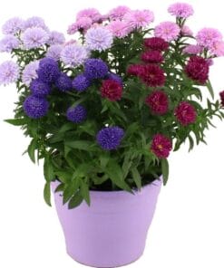 Deze dubbelbloemige Aster in de kleuren blauw, lavendel, roze en rood is een echte blikvanger. Geef deze plant in roze pot een mooie plek op het terras of balkon en geniet nog lang van deze prachtige langdurig bloeiende plant.
