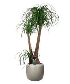De Beaucarnea recurvata komt uit Midden-Amerika en wordt door de robuuste stam en de knolvormige verdikte voet ook wel olifantenpoot genoemd. In deze stam en voet slaat de plant zelf zijn water op. Zo’n enorme kamerplant met twee ‘armen’ geeft jouw interieur direct een geweldige eye-catcher.