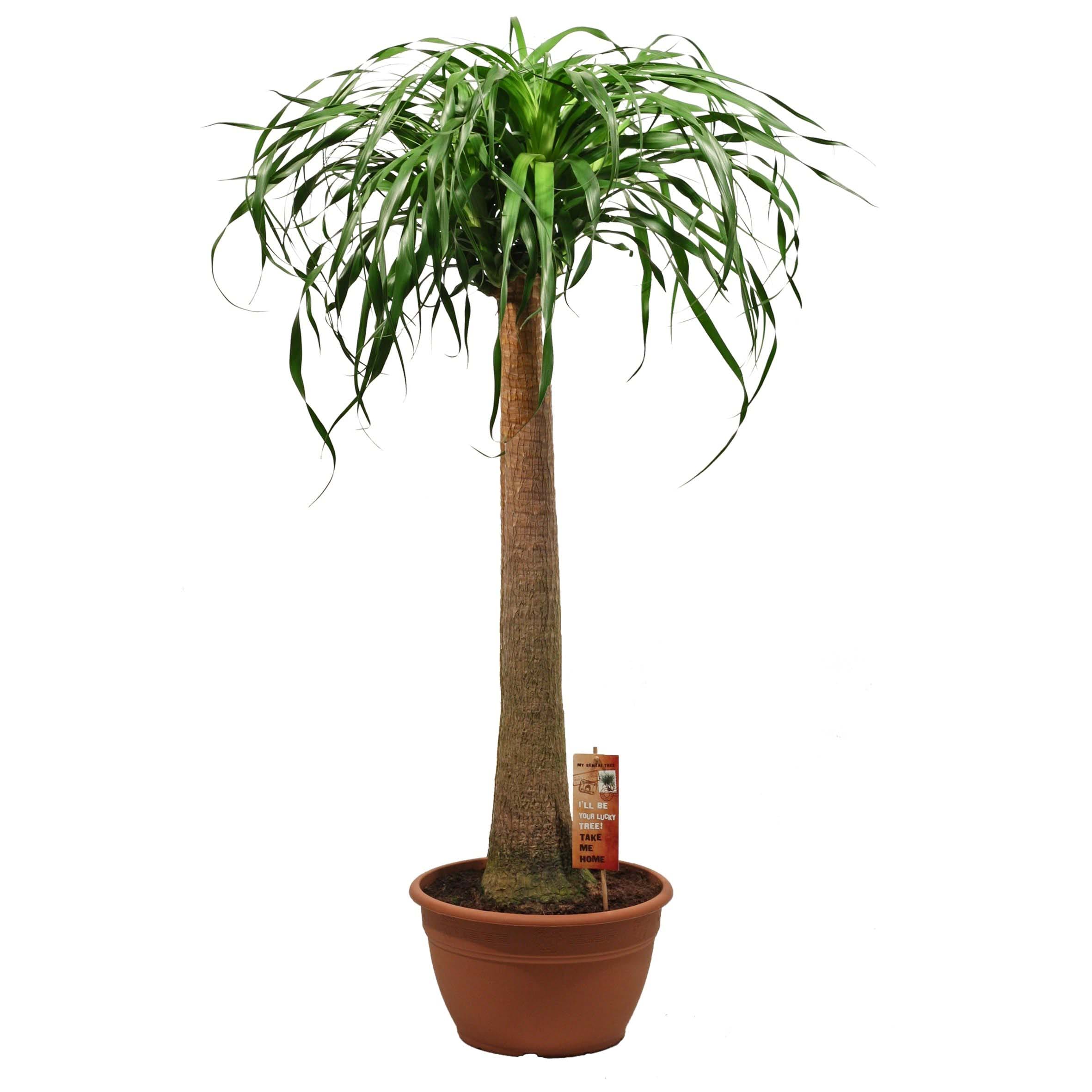 Kijk eens naar de grappige vorm van de voet bij deze Beaucarnea: net een fles! Klopt, de plant gebruikt de voet om water op te slaan. De Beaucarnea heet ook wel olifantsvoet en is zeer decoratief door zijn woeste pluim. De Beaucarnea is afkomstig uit tropische en subtropische gebieden in Azië en Afrika. Deze stijlvolle, makkelijk te verzorgen plant, is 3,5 jaar oud voordat de kleinste variant verkocht wordt. Oudere planten kunnen wel tot 15 jaar oud zijn voordat ze de kwekerij verlaten! Tip van onze kweker: ‘zorg dat de bladeren vrij kunnen hangen, want als ze contact maken met een muur, kast of gordijn, kunnen ze bruin worden’.