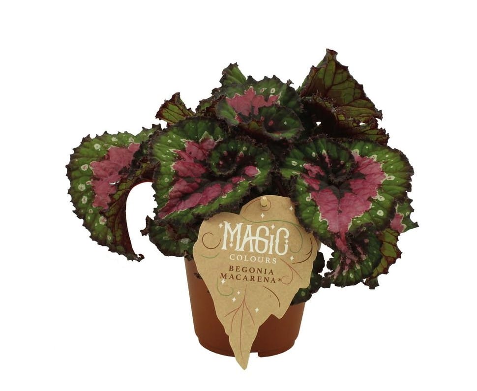 De bladeren van de Begonia Macarena hebben bijzondere patronen en kleuren.