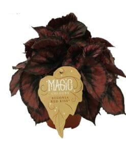 De Begonia ‘Red Kiss’ heeft helder metallic rood blad. De bladeren hebben een donkere rand.