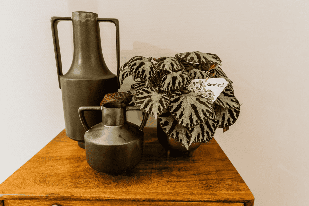 De Begonia ‘Silver Jewell’ heeft fraai gekleurd blad met een zilverkleurige glans.