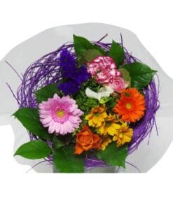 Dit boeket is geschikt in een sisal bloemenmanchet. Dit manchet bestaat uit een draadstructuur die taps toeloopt aan de onderkant. De kleur van de sisal houder geeft een extra dimensie aan het boeket.