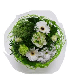 Dit boeket is uitgevoerd in het wit. Witte bloemen staan voor puurheid en eenvoud.