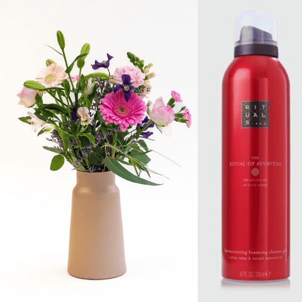 Gecombineerd met een bijpassende vaas in zandkleur en een heerlijke Rituals Ayurveda Foaming Showergel 200ml.