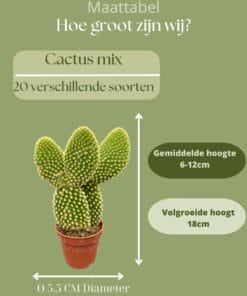Deze set bevat: een mix van 20 verschillende soorten cactussen, de potten hebben een diameter van 5.5 centimeter, de planten zijn 6 tot 12 centimeter hoog.