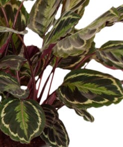 Deze Calathea Medaillon heeft grote bladeren met prachtige patronen op het blad. Zowel aan de onderkant als aan de bovenkant van het blad kent de Calathea prachtige kleuren. ’s Avonds keren de bladeren zich naar binnen, zodat je de onderkant beter kunt zien. De Calathea Medaillon heeft diepe kleuren. Oorspronkelijk komt de Calathea uit de jungle.