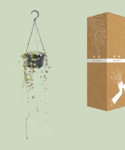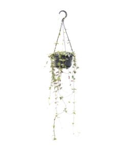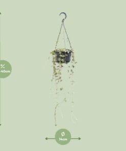 Maak kennis met Ceropegia Linearis ‘Remy’, ook wel bekend als Ceropegia, de perfecte aanvulling op je indoor plantencollectie. Oorspronkelijk afkomstig uit de woestijngebieden van Zuid-Afrika, heeft deze unieke vetplant afhangende stengels met charmante hartvormige bladeren. In de zomermaanden bloeien delicate bloemen, die lijken op kleine paarse lantaarns, waardoor elke ruimte een vleugje schoonheid krijgt. Met zijn lage onderhoudseisen en luchtzuiverende eigenschappen is Ceropegia Linearis ‘Remy’ een must-have voor plantenliefhebbers. Haal de schoonheid van de woestijn binnenshuis en geniet van de rustgevende aanwezigheid van deze prachtige Ceropegia-variëteit. Ceropegia gedijt goed op een plek met halfschaduw en heeft wekelijks water nodig. Het geeft de voorkeur aan goed doorlatende en zanderige grond. Om gezonde groei te bevorderen, wordt aanbevolen om de plant elke twee weken van lente tot zomer te bemesten. Gebruik hiervoor een evenwichtige meststof verdund tot halve sterkte. Vermijd overbemesting, omdat dit kan leiden tot verbranding van de wortels. Vergeet niet om de grond tussen het water geven lichtjes te laten opdrogen om wortelrot te voorkomen. Met de juiste zorg en aandacht zal je Ceropegia gedijen en zijn charmante hartvormige bladeren tonen.Wist je dat Ceropegia Linearis ‘Remy’, ook bekend als String of Hearts, een populaire plant is voor decoratie vanwege zijn unieke uiterlijk? Deze hangende vetplant heeft hartvormige bladeren die in paren groeien langs dunne, delicate ranken, waardoor het een heerlijke toevoeging is aan elk huis of kantoorruimte. Het is echter belangrijk op te merken dat deze plant puur decoratief is en niet eetbaar. Dus, hoewel het je oog kan vangen met zijn fascinerende schoonheid, zorg ervoor om ervan te genieten op een afstand en weerhoud jezelf ervan om aan de bladeren te knabbelen!• Ceropegia Linearis ‘Remy’ heeft een potmaat van 14 cm.• De plant is ongeveer 38 cm hoog.• Ceropegia Linearis ‘Remy’ staat ook bekend als Ceropegia.• Deze plant houdt van een plekje in gedeeltelijke schaduw.• Leuk weetje: Ceropegia planten worden ook vaak ‘String of Hearts’ genoemd vanwege hun lange hangende stelen met hartvormige bladeren.