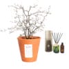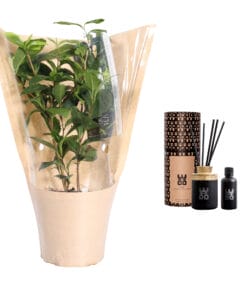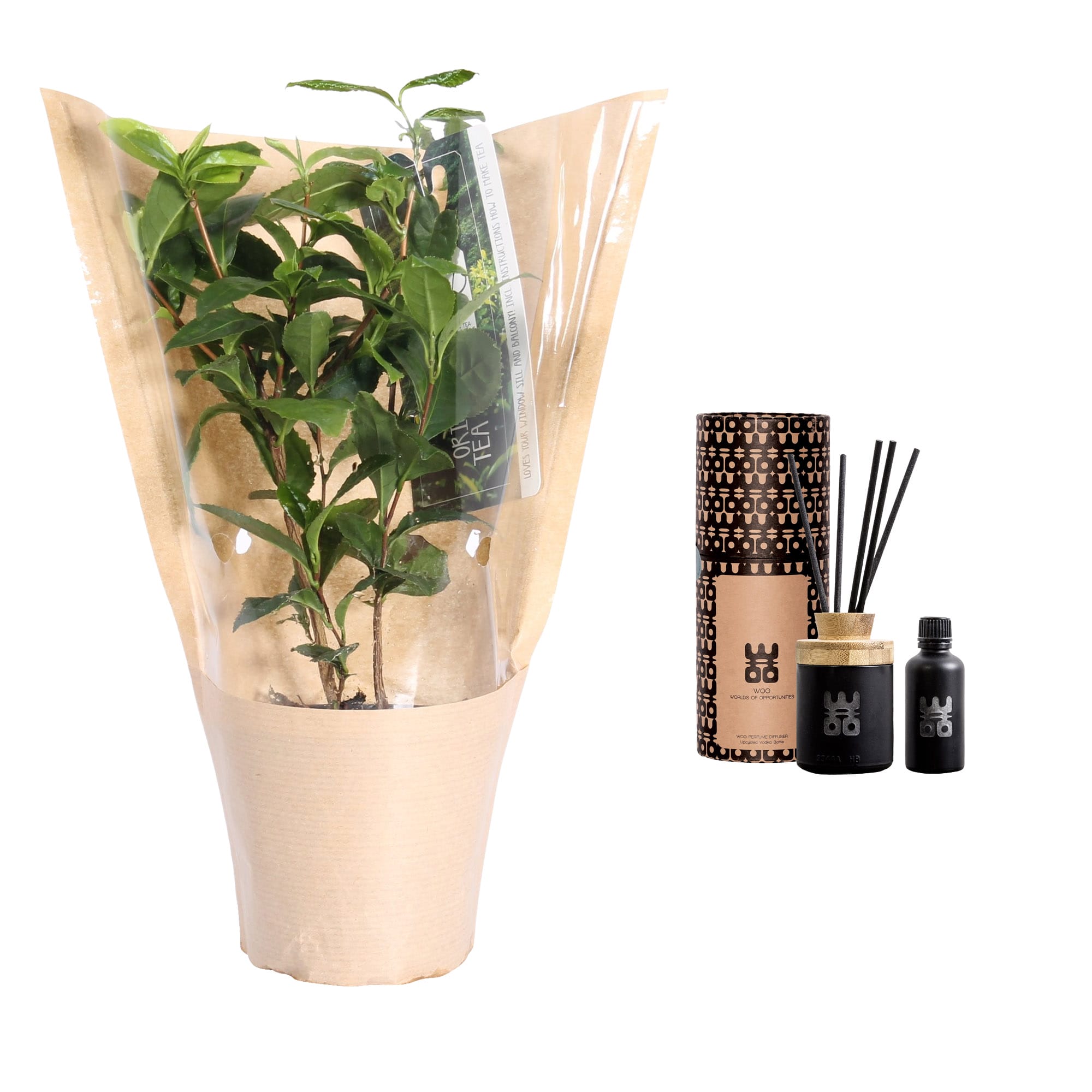 Thee van Nederlandse bodem. Deze echte theeplant van “TeabyMe” stelt jou in staat om zelf thee te kweken (geschikt voor het Europese klimaat). Geniet van jouw eigen thee en de heerlijke geur van de WOO- diffuser zwart (50 ml Tranguility), gemaakt van handgeraapte en -bewerkte kleine zwarte Wodka flessen, afgedekt met een natuurlijke bamboe deksel en gevuld met duurzaam geproduceerde exclusieve parfum.