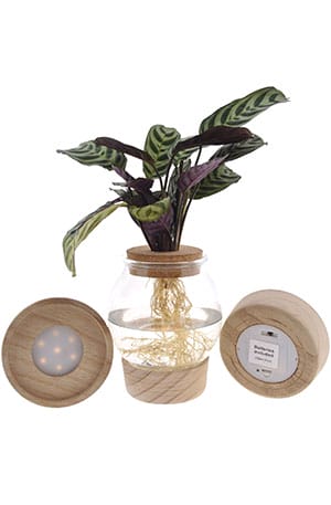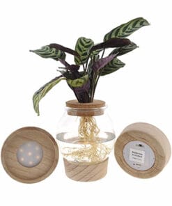 Als het donker wordt gaat de Ctenanthe slapen, daardoor zie je overdag de mooi gestreepte bovenkant van het blad, en als het donker wordt de mooie paarse onderkant. Schrik dus niet als je ’s avonds wat geritsel hoort: dit zijn bladeren die langs elkaar schuiven! Daarnaast een geweldige eye-catcher doordat de LED verlichting de plant mooi doet op schijnen.