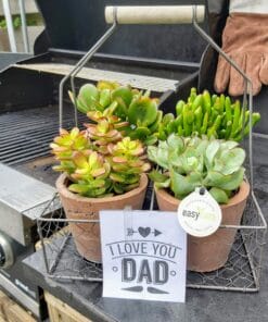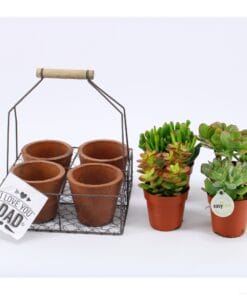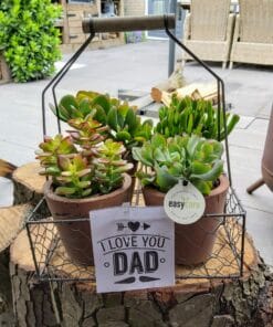 Een stoere ijzeren “ gereedschapskist” met 4 makkelijke vetplanten! Een cadeau wat iedere vader kan verzorgen. De Crassula soorten hebben een eigen wateropslag dus een weekje vergeten water te geven kan geen kwaad. Uiteraard ontbreekt de “ I love you DAD” kaart niet.