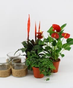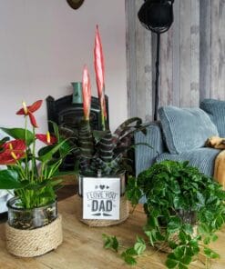 Houd jouw vader van zwaarden, en jij van hartjes? In dit pakket vind je de Vriesea Era met 3 zwaardvormige bloemen en de Anthurium met de hartvormige bloemen en bladeren. Zo laat jij zien dat je van je vader houdt. Uiteraard met een “ I love you DAD” kaart bijgevoegd.