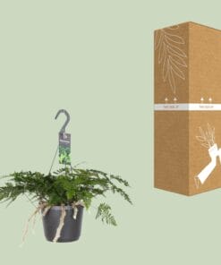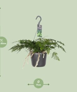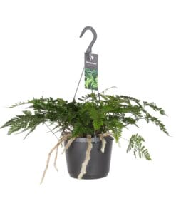 Maak kennis met de betoverende Davallia Teyermannii, ook wel bekend als het Konijnenvoetvaren! Deze kamerplant, van oorsprong uit Fiji, betovert met zijn kenmerkende harige wortelstokken die lijken op konijnenpootjes, waardoor het een buitengewone toevoeging is aan elke ruimte. Met zijn sierlijke groene bladeren straalt deze varen elegantie en charme uit, en verhoogt het de esthetiek van jouw binnenomgeving. Breng de schoonheid van de natuur naar binnen en laat de Konijnenvoetvaren dienen als een prachtig middelpunt van jouw huis of kantoor, terwijl het zorgt voor een gevoel van rust en harmonie. Maak kennis met de prachtige Davallia, een must-have toevoeging aan elke plantenliefhebber’s collectie. Deze unieke plant gedijt goed in halfschaduwrijke gebieden, waardoor het veelzijdig is voor verschillende binnen- en buitenomgevingen. Om deze schoonheid te laten bloeien, geef het indirect zonlicht en eenmaal per week water. Zijn weelderige groene bladeren voegen een vleugje elegantie en rust toe aan elke ruimte. Bestel vandaag nog uw Davallia Teyermannii en ervaar de vreugde van het koesteren van deze opmerkelijke plant.Wist je dat Davallia Teyermannii, ook wel bekend als de Kangaroo Fern, een unieke en fascinerende kamerplant is? De bladeren lijken op kangoeroepoten, vandaar de naam! Deze varen gedijt goed bij weinig licht, waardoor het een perfecte keuze is voor binnenhuisdecoratie. Let er echter op dat Davallia bullata alleen decoratief is en niet eetbaar. Dus het is het beste om te genieten van de speelse bladeren in plaats van eraan te knabbelen. Houd dit leuke feitje in gedachten terwijl je geniet van de betoverende aanwezigheid van je Kangaroo Fern!De Davallia Teyermannii, ook wel bekend als het Konijnenvoetvaren, is een populaire kamerplant met een potmaat van 17 cm.Deze prachtige plant groeit meestal tot ongeveer 30 cm hoogte, waardoor het een ideale keuze is voor kleinere ruimtes of tafelbladen.De Konijnenvoetvaren gedijt op een plek met gedeeltelijke schaduw, waar het de juiste hoeveelheid licht kan ontvangen zonder blootgesteld te worden aan direct zonlicht.Een interessant feit over Davallia is dat het beroemd is om zijn unieke wortelstokken die lijken op een konijnenvoet, vandaar de algemene naam.Met zijn aantrekkelijke bladeren en lage onderhoudseisen is Davallia bullata een visueel aantrekkelijke en gemakkelijk te verzorgen keuze voor elke plantenliefhebber.