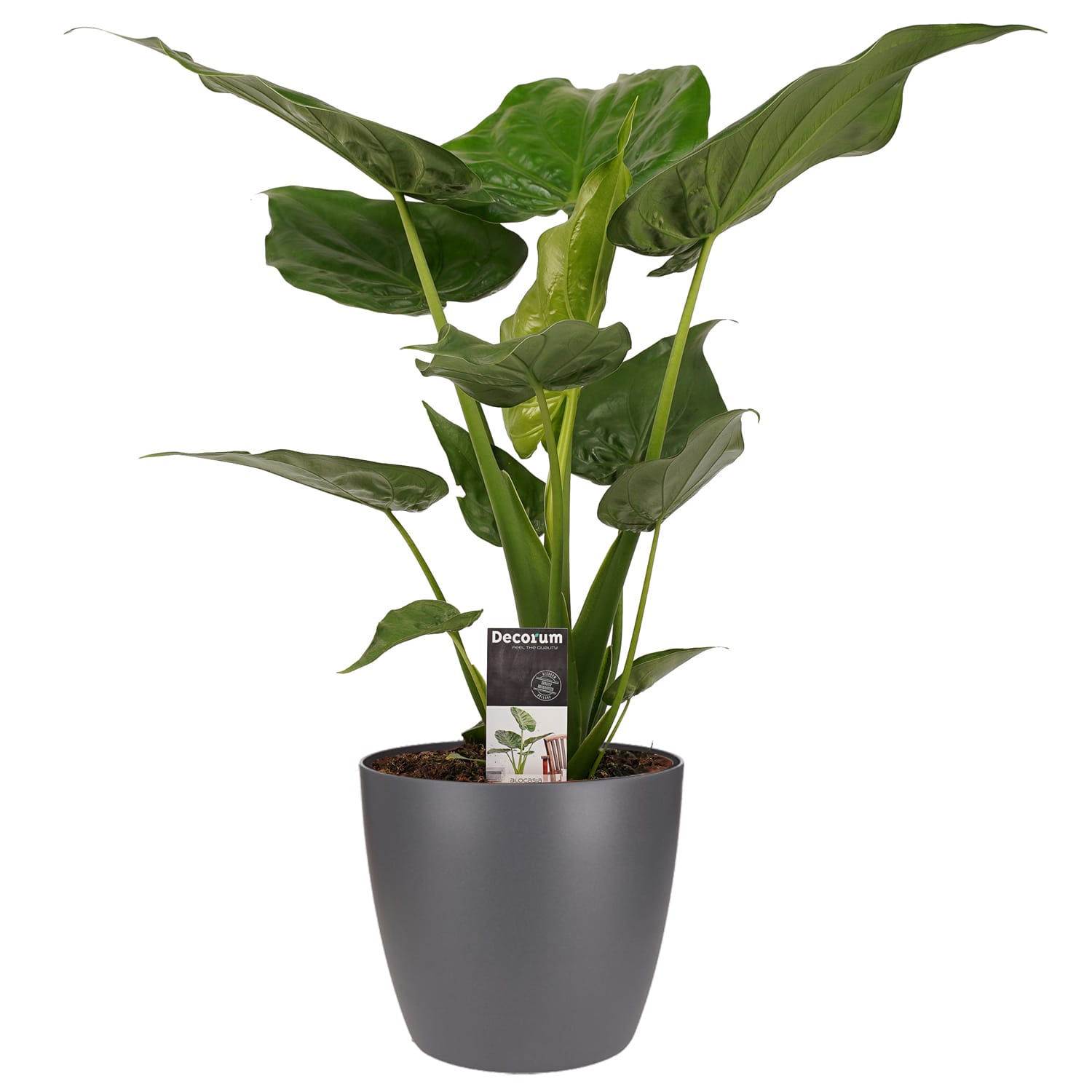 Dit hippe familielid van de Alocasia- familie is een opvallende verschijning. De plant druppelt niet en is dus veilig voor je vloer. Deze plant wordt geleverd met een stijlvolle ELHO pot