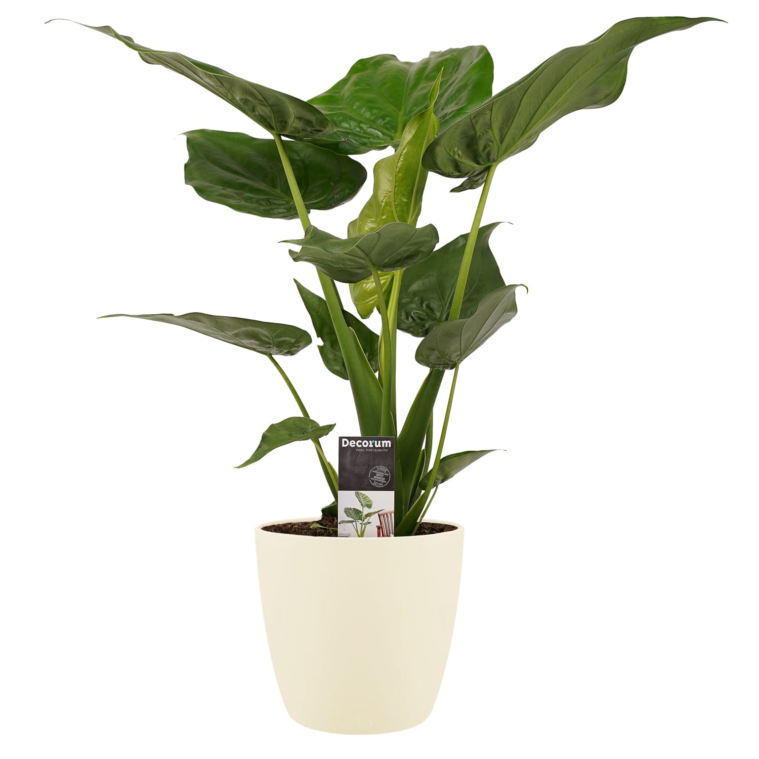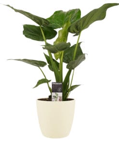 Dit hippe familielid van de Alocasia- familie is een opvallende verschijning. De plant druppelt niet en is dus veilig voor je vloer. Deze plant wordt geleverd met een stijlvolle ELHO pot