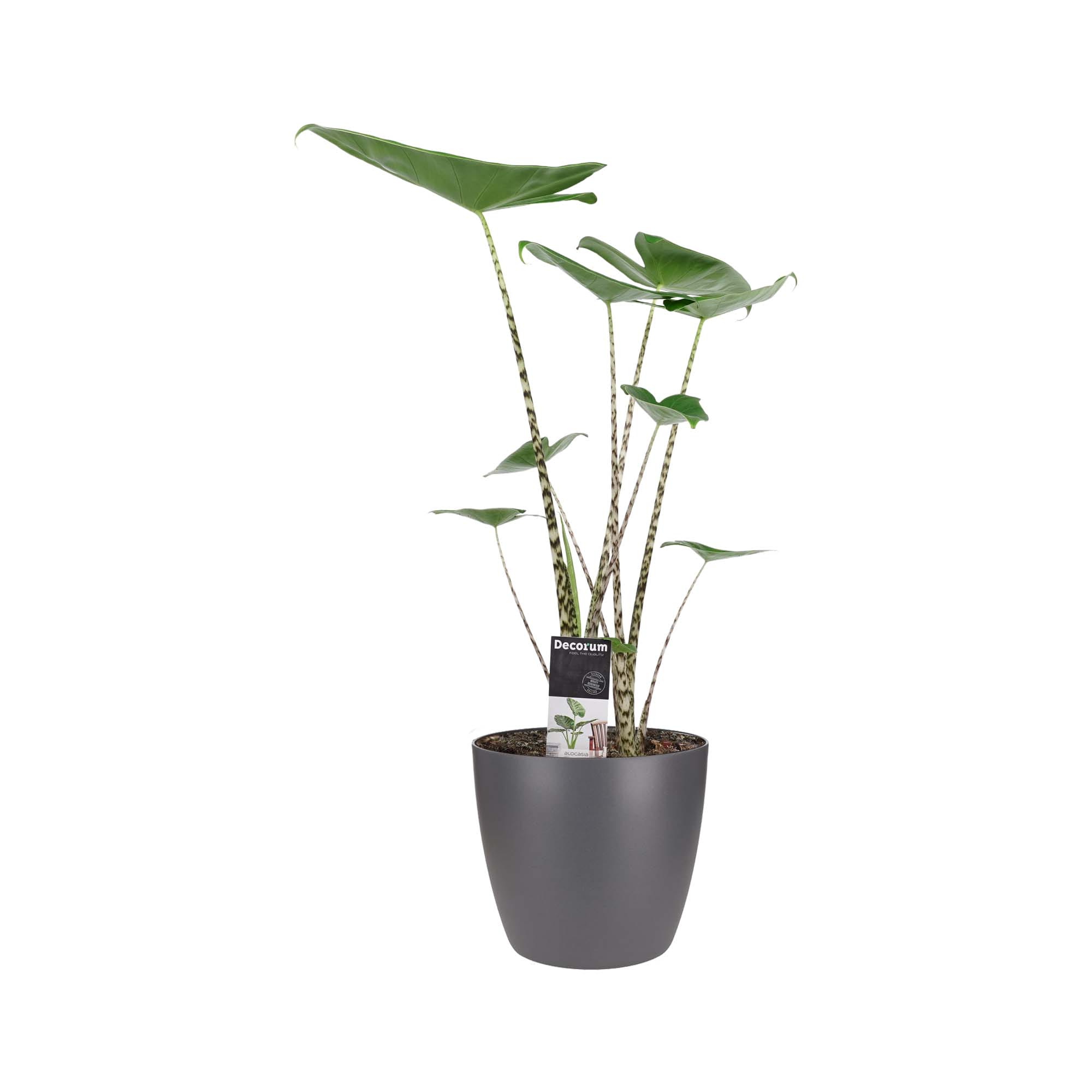 Met zijn gestreepte stelen en scherpe lijnen in het blad is deze leuke Alocasia een opvallende verschijning.