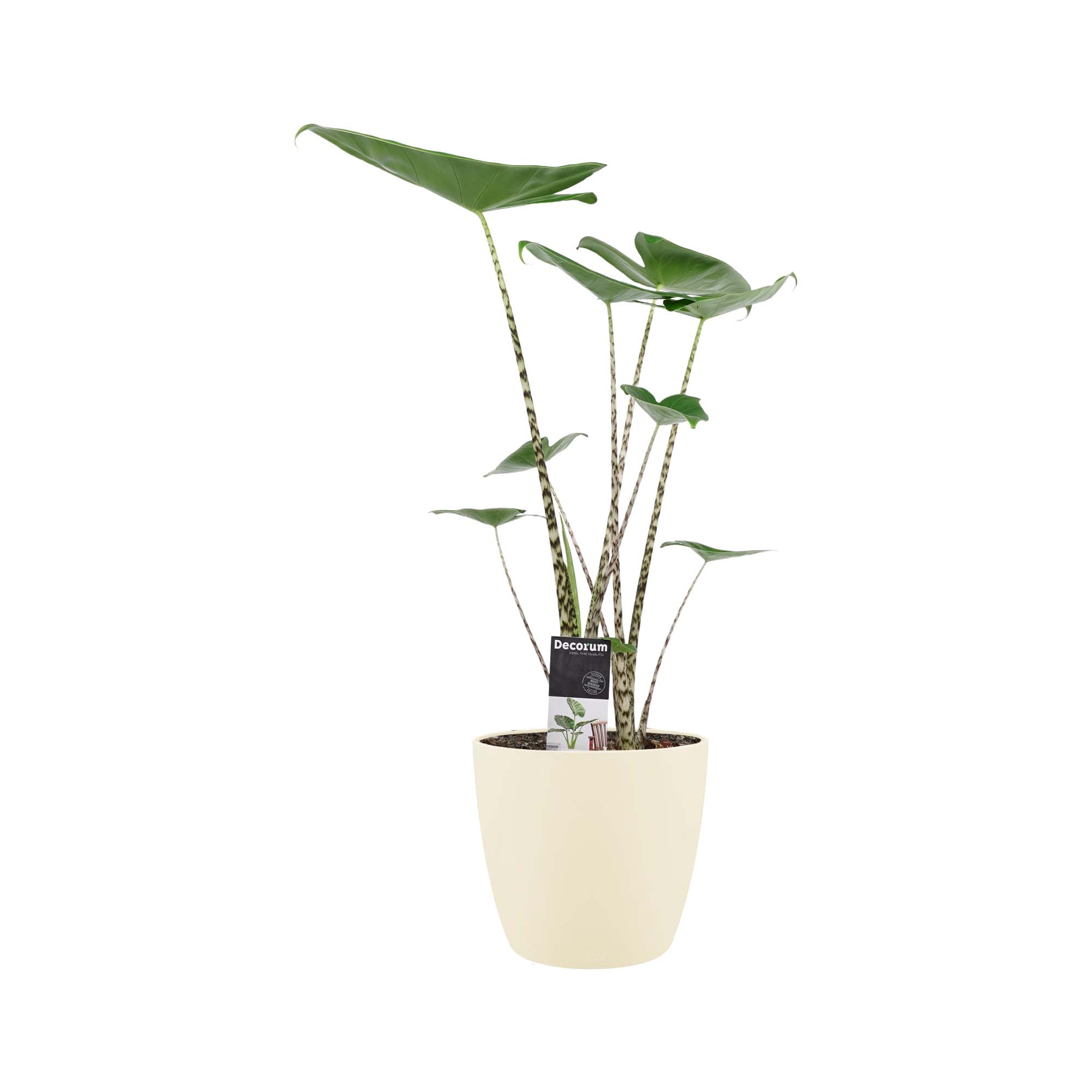Met zijn gestreepte stelen en scherpe lijnen in het blad is deze leuke Alocasia een opvallende verschijning.