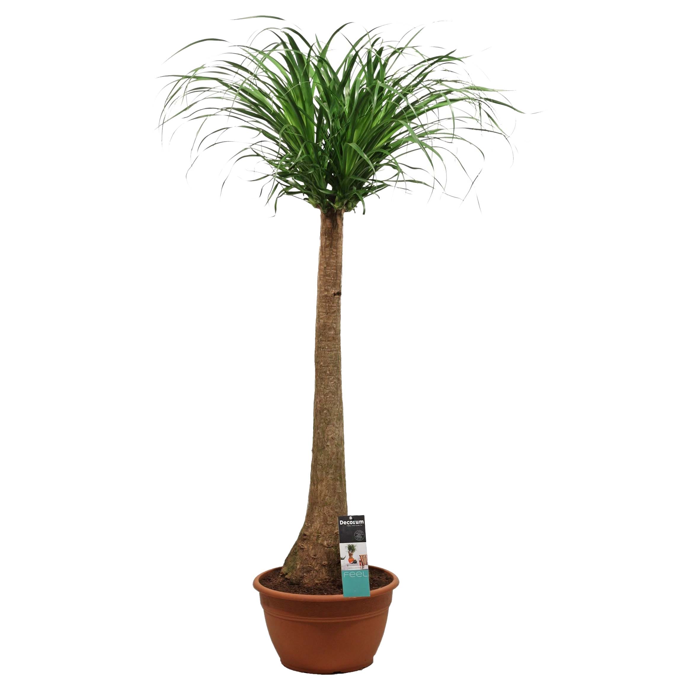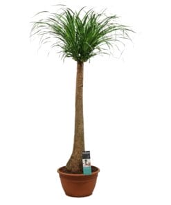 Kijk eens naar de grappige vorm van de voet bij deze Beaucarnea: net een fles! Klopt, de plant gebruikt de voet om water op te slaan. De Beaucarnea heet ook wel olifantsvoet en is zeer decoratief door zijn woeste pluim. De Beaucarnea is afkomstig uit tropische en subtropische gebieden in Azië en Afrika. Deze stijlvolle, makkelijk te verzorgen plant, is 3,5 jaar oud voordat de kleinste variant verkocht wordt. Oudere planten kunnen wel tot 15 jaar oud zijn voordat ze de kwekerij verlaten! Tip van onze kweker: ‘zorg dat de bladeren vrij kunnen hangen, want als ze contact maken met een muur, kast of gordijn, kunnen ze bruin worden’.
