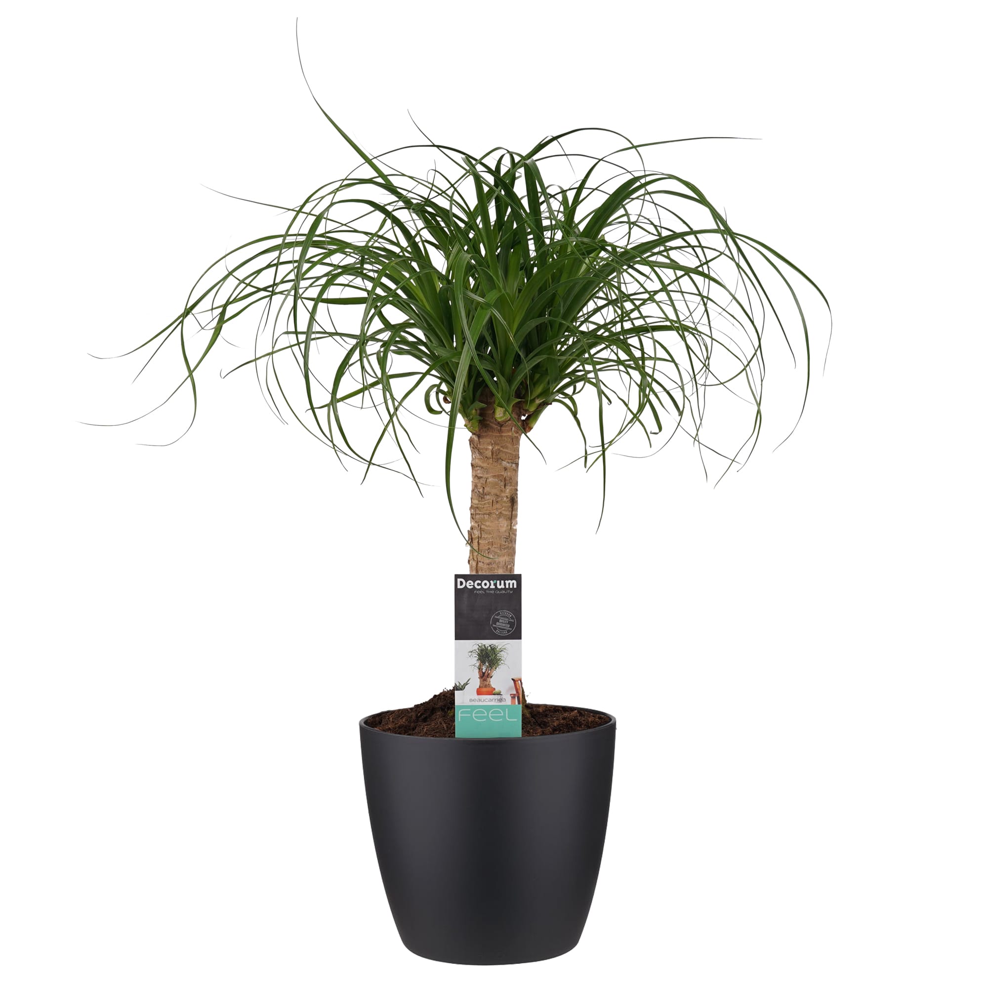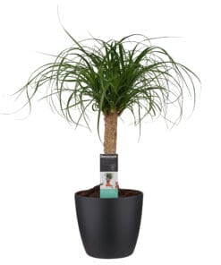 Kijk eens naar de grappige vorm van de voet bij deze Beaucarnea: net een fles! Klopt, de plant gebruikt de voet om water op te slaan. De Beaucarnea heet ook wel olifantsvoet en is zeer decoratief door zijn woeste pluim. De Beaucarnea is afkomstig uit tropische en subtropische gebieden in Azië en Afrika. Deze stijlvolle, makkelijk te verzorgen plant, is 3,5 jaar oud voordat de kleinste variant verkocht wordt. Oudere planten kunnen wel tot 15 jaar oud zijn voordat ze de kwekerij verlaten! Tip van onze kweker: ‘zorg dat de bladeren vrij kunnen hangen, want als ze contact maken met een muur, kast of gordijn, kunnen ze bruin worden’.