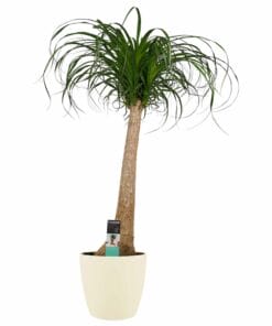 Kijk eens naar de grappige vorm van de voet bij deze Beaucarnea: net een fles! Klopt, de plant gebruikt de voet om water op te slaan. De Beaucarnea heet ook wel olifantsvoet en is zeer decoratief door zijn woeste pluim.
