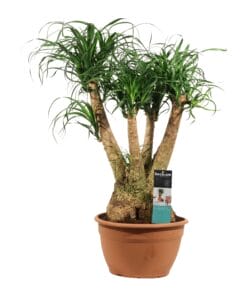 De Beaucarnea of olifantspoot, is afkomstig uit tropische en subtropische gebieden in Azië en Afrika. Deze stijlvolle, makkelijk te verzorgen plant, is 3,5 jaar oud voordat de kleinste variant verkocht wordt. Oudere planten kunnen wel tot 15 jaar oud zijn voordat ze de kwekerij verlaten! Tip van onze kweker: ‘zorg dat de bladeren vrij kunnen hangen, want als ze contact maken met een muur, kast of gordijn, kunnen ze bruin worden.