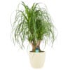 Kijk eens naar de grappige vorm van de voet bij deze Beaucarnea: net een fles! Klopt, de plant gebruikt de voet om water op te slaan. De Beaucarnea heet ook wel olifantsvoet en is zeer decoratief door zijn woeste pluim. De Beaucarnea is afkomstig uit tropische en subtropische gebieden in Azië en Afrika. Deze stijlvolle, makkelijk te verzorgen plant, is 3,5 jaar oud voordat de kleinste variant verkocht wordt. Oudere planten kunnen wel tot 15 jaar oud zijn voordat ze de kwekerij verlaten! Tip van onze kweker: ‘zorg dat de bladeren vrij kunnen hangen, want als ze contact maken met een muur, kast of gordijn, kunnen ze bruin worden’.