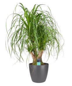 Kijk eens naar de grappige vorm van de voet bij deze Beaucarnea: net een fles! Klopt, de plant gebruikt de voet om water op te slaan. De Beaucarnea heet ook wel olifantsvoet en is zeer decoratief door zijn woeste pluim. De Beaucarnea is afkomstig uit tropische en subtropische gebieden in Azië en Afrika. Deze stijlvolle, makkelijk te verzorgen plant, is 3,5 jaar oud voordat de kleinste variant verkocht wordt. Oudere planten kunnen wel tot 15 jaar oud zijn voordat ze de kwekerij verlaten! Tip van onze kweker: ‘zorg dat de bladeren vrij kunnen hangen, want als ze contact maken met een muur, kast of gordijn, kunnen ze bruin worden’.
