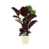 Calathea’s zijn herkenbaar aan hun prachtige blad tekeningen en vele kleuren. De Calathea ‘Medallion’ heeft donkergroene en lichtgroene bladeren met een paarse onderkant.
