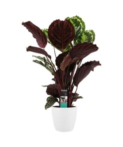 Calathea’s zijn herkenbaar aan hun prachtige blad tekeningen en vele kleuren. De Calathea ‘Medallion’ heeft donkergroene en lichtgroene bladeren met een paarse onderkant.