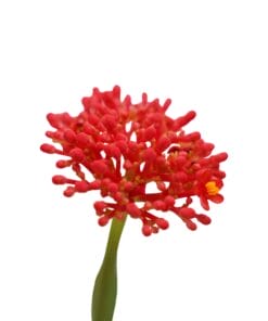 Het soort Jatropha Multifida (oftewel Coral plant) heeft mooie rode bloemen zoals rood koraal. De grote diep ingesneden bladeren zijn donker groen aan de bovenkant en grijsachtig aan de onderkant.