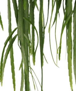 “Deze plant heeft eigenlijk helemaal geen bladeren, de lange slierten die je ziet zijn gewoon z’n stengels. Bij elkaar zien ze eruit als een weelderige haardos van een zeemeermin die haar haar niet helemaal onder controle heeft. De nieuwe stengels groeien namelijk eerst een eindje de lucht in voor ze ombuigen en gaan hangen. Als je Lepismium Bolivianum op een ideale plek staat en je ‘m goed verzorgt, heb je kans dat ‘ie in het voor- of najaar gaat bloeien. Geef je Lepismium bolivianum pas water als de aarde gort en gortdroog is. Van teveel water gaat je Lepismium rotten. En dat wil je niet! Tussen november en begin maart zet je je Lepismium op dieet met nog maar eens in de maand een scheut water. In maart bouw je weer op met eerst twee keer per maand en als de zon lekker in hitte toeneemt (mei) elke week een scheut.