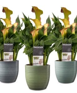 De Zantedeschia of Calla is een klassieke schoonheid met zijn gekleurde kelken, Afrikaanse roots en zonnige karakter. Deze plant groeide nietsvermoedend op in Zuid-Afrika, totdat in de 18de eeuw een Italiaan met de naam Giovanni Zantedeschi de plant mee nam naar zijn geboorteland. Daar werd de nieuweling prompt naar hem vernoemd: Zantedeschia. Inmiddels noemen we de plant vaker Calla, hoewel sommigen liever ‘bekerplant’ aanhouden, want volgens mythen dronken Griekse goden uit de kelk van deze bloem! De Zantedeschia is klassiek, maar heeft ook iets stoers en past daarom goed in verschillende interieur stijlen, het is maar net welke pot je erbij kiest!