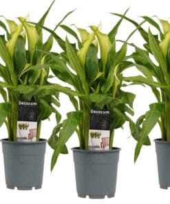 De Zantedeschia of Calla is een klassieke schoonheid met zijn gekleurde kelken, Afrikaanse roots en zonnige karakter. Deze plant groeide nietsvermoedend op in Zuid-Afrika, totdat in de 18de eeuw een Italiaan met de naam Giovanni Zantedeschi de plant mee nam naar zijn geboorteland. Daar werd de nieuweling prompt naar hem vernoemd: Zantedeschia. Inmiddels noemen we de plant vaker Calla, hoewel sommigen liever ‘bekerplant’ aanhouden, want volgens mythen dronken Griekse goden uit de kelk van deze bloem! De Zantedeschia is klassiek, maar heeft ook iets stoers en past daarom goed in verschillende interieur stijlen, het is maar net welke pot je erbij kiest!