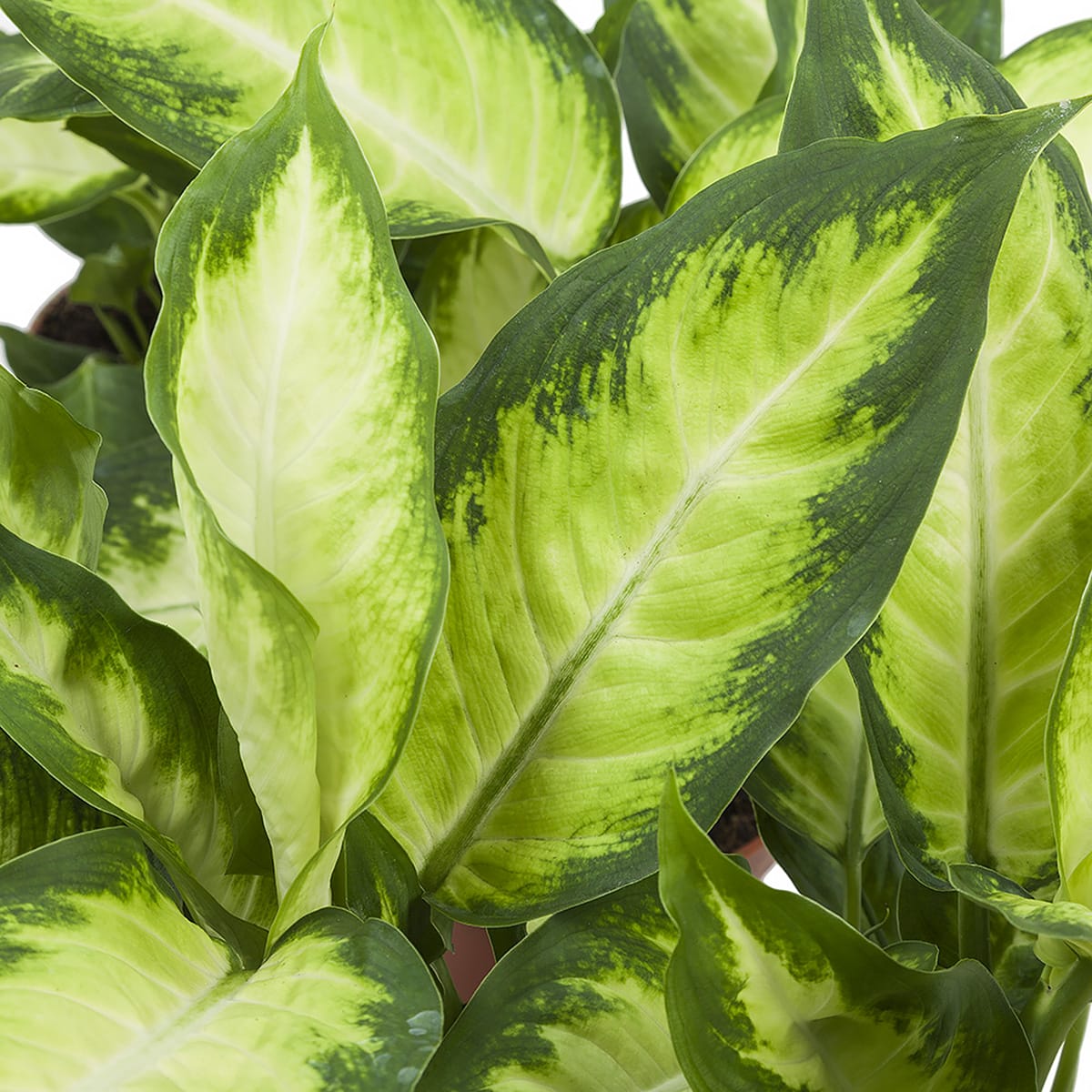 De Dieffenbachia draagt veel, groot blad, dat wit tot lichtgroen is met een fraaie groene rand. Daarmee is de plant zeer karakteristiek aanwezig.