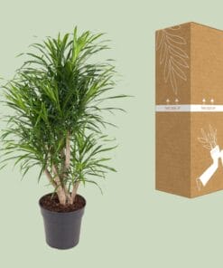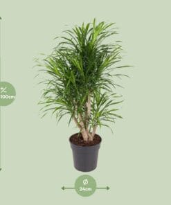Op zoek naar een prachtige kamerplant? Zoek niet verder dan Dracaena Anita, ook bekend als Dragontree. Met zijn oorsprong in tropische gebieden, brengt deze plant een vleugje elegantie in elke ruimte. Met levendige groene, lancetvormige bladeren en een slanke, rechtopstaande stam is Dracaena Anita niet alleen visueel aantrekkelijk, maar ook gemakkelijk te verzorgen. Of je nu een ervaren plantenliefhebber bent of net begint met je binnen tuin, deze onderhoudsarme plant is een must-have om een vleugje natuurlijke schoonheid aan je huis of kantoor toe te voegen. Dracaena is een onderhoudsarme plant die gedijt op een plek met gedeeltelijke schaduw. Het heeft slechts één keer per week water nodig, waarbij de grond tussen de gietbeurten uitdroogt om overbewatering te voorkomen. Het ideale grondtype voor een Drakenbloedboom is goed doorlatende, vruchtbare grond die veenmos of compost bevat.Wat betreft bemesting wordt aanbevolen om de plant tijdens het groeiseizoen (lente en zomer) elke 2-4 weken te voorzien van een gebalanceerde vloeibare meststof. Wees echter voorzichtig dat je niet te veel bemest, omdat dit kan leiden tot verbrande wortels en schade aan het blad.Wist je dat Dracaena Anita, een populaire kamerplant, niet alleen een prachtige decoratie is, maar ook een natuurlijke luchtzuiveraar? De levendige groene bladeren kunnen helpen om de luchtkwaliteit te verbeteren door giftige stoffen zoals formaldehyde en benzeen te verwijderen. Het is echter belangrijk om op te merken dat hoewel Dracaena Anita er verleidelijk uit kan zien, vooral met zijn drakenachtige naam, het niet geschikt is voor consumptie. Laten we deze charmante plant dus als een visueel genot in onze huizen houden en zijn schoonheid bewonderen, maar onthoud dat je er geen hap van moet nemen!- Dracaena Anita is een populaire kamerplant met een potmaat van 24 cm.- Deze plant kan een hoogte van ongeveer 100 cm bereiken, waardoor het een uitstekende keuze is om groen toe te voegen aan elke ruimte.- Dracaena Anita staat ook bekend als de Drakenbloedboom, wat een vleugje mystiek en intrige toevoegt aan zijn identiteit.- Deze plant gedijt op een plek met halfschaduw, waardoor het zich aan verschillende lichtomstandigheden kan aanpassen en geschikt is voor verschillende ruimtes in een huis of kantoor.- Leuk weetje: Dracaena Anita is niet alleen een prachtige plant, maar heeft ook luchtzuiverende eigenschappen die helpen de luchtkwaliteit te verbeteren waar hij geplaatst is.