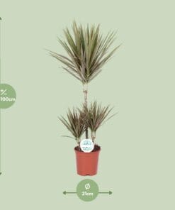 Op zoek naar wat natuurlijke schoonheid in je binnenruimte? Maak kennis met Dracaena Bicolor, ook wel bekend als Dragontree. Afkomstig uit tropisch Afrika, heeft deze prachtige kamerplant levendige groene bladeren met een vleugje geel in het midden, waardoor elke kamer een vleugje exotische allure krijgt. Met zijn luchtzuiverende eigenschappen voegt Dracaena Bicolor niet alleen visuele aantrekkingskracht toe, maar helpt het ook de luchtkwaliteit in je huis of kantoor te verbeteren. Gemakkelijk te verzorgen en met minimaal onderhoud nodig, is deze plant de perfecte aanvulling op je binnen tuin. Dracaena, ook bekend als Drakenplant, gedijt op een plek met halfschaduw en moet eens per week bewaterd worden. Het geeft de voorkeur aan goed doorlatende grond, zoals een mengsel van veenmos, zand en perliet. Om optimale groei te garanderen, bemest de plant elke 2-3 maanden met een uitgebalanceerde kamerplantenmeststof. Wees voorzichtig om niet te veel te bemesten, omdat dit de plant kan beschadigen. Daarnaast is het belangrijk om af en toe de bladeren af te vegen om stof te verwijderen en gezonde groei te bevorderen. Met de juiste verzorging zal jouw Dracaena floreren en een vleugje natuurlijke schoonheid toevoegen aan jouw ruimte.Een fascinerend feit over de Dracaena Bicolor is dat de levendige bladeren van kleur kunnen veranderen op basis van de hoeveelheid zonlicht die ze ontvangen. Deze plant vertoont opvallende groene en gele strepen wanneer hij wordt gekweekt in matig licht, maar naarmate de lichtintensiteit toeneemt, veranderen de bladeren in prachtige tinten roze en rood. Het is een verbluffende toevoeging aan elke binnenruimte en brengt moeiteloos leven en natuurlijke schoonheid in uw huis. Het is echter belangrijk om op te merken dat de Dracaena Bicolor puur voor decoratieve doeleinden is en niet geschikt is voor consumptie. Laat deze prachtige plant dus uw ruimte opvrolijken, maar denk eraan om hem uit de keuken te houden!- Dracaena Bicolor is een populaire kamerplant met een bloempotmaat van 21 cm, waardoor hij geschikt is voor kleinere ruimtes.- Deze variëteit van Dracaena groeit meestal tot ongeveer 95 cm hoogte en voegt een vleugje groen en elegantie toe aan elke kamer.- Dracaena Bicolor staat ook bekend als Drakenbloedboom en voegt een vleugje mysterie en intrige toe aan zijn naam.- Deze plant geeft de voorkeur aan een plek met halfschaduw, waardoor hij zich aan verschillende verlichtingsomstandigheden kan aanpassen.- Leuk weetje: Dracaena Bicolor zou luchtzuiverende eigenschappen hebben en helpt de kwaliteit van binnenlucht te verbeteren door schadelijke gifstoffen natuurlijk te filteren.