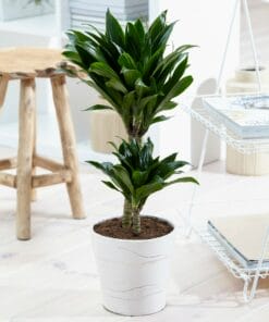 Geef snel een tropisch tintje aan je interieur met deze twee luchtzuiverende en makkelijk te verzorgen Dracaena’s. De toevoeging “Compacta” slaat op zijn relatief korte bladeren die daardoor wat stoerder oogt. Deze plant heeft 2 stammen in een pot van 17cm diameter. Er zijn wel 120 verschillende soorten dracaena, waarvan sommige een bloedrode hars produceren. Daarom wordt hij ook wel drakenboom of drakenbloedboom genoemd. “Deremensis” is een synonym voor de soortnaam “Fragrans”. Deze naam heeft hij omdat er heel sterk geurende bloemen in kunnen komen. Thuis gebeurt dit trouwens bijna nooit! Een dracaena is heel makkelijk te verzorgen, doordat hij best wel even zonder water kan. Deze dracaena is ook een van de planten die de lucht in huis kan zuiveren! Dat betekent dat hij niet alleen CO2 omzet in zuurstof, maar dat hij ook allerlei schadelijke stoffen uit de lucht haalt. Perfect voor woningen in de stad en voor huizen met weinig ventilatie!
