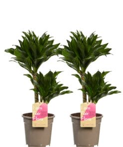 Geef snel een tropisch tintje aan je interieur met deze twee luchtzuiverende en makkelijk te verzorgen Dracaena’s. De toevoeging “Compacta” slaat op zijn relatief korte bladeren die daardoor wat stoerder oogt. Deze plant heeft 2 stammen in een pot van 17cm diameter. Er zijn wel 120 verschillende soorten dracaena, waarvan sommige een bloedrode hars produceren. Daarom wordt hij ook wel drakenboom of drakenbloedboom genoemd. “Deremensis” is een synonym voor de soortnaam “Fragrans”. Deze naam heeft hij omdat er heel sterk geurende bloemen in kunnen komen. Thuis gebeurt dit trouwens bijna nooit! Een dracaena is heel makkelijk te verzorgen, doordat hij best wel even zonder water kan. Deze dracaena is ook een van de planten die de lucht in huis kan zuiveren! Dat betekent dat hij niet alleen CO2 omzet in zuurstof, maar dat hij ook allerlei schadelijke stoffen uit de lucht haalt. Perfect voor woningen in de stad en voor huizen met weinig ventilatie!